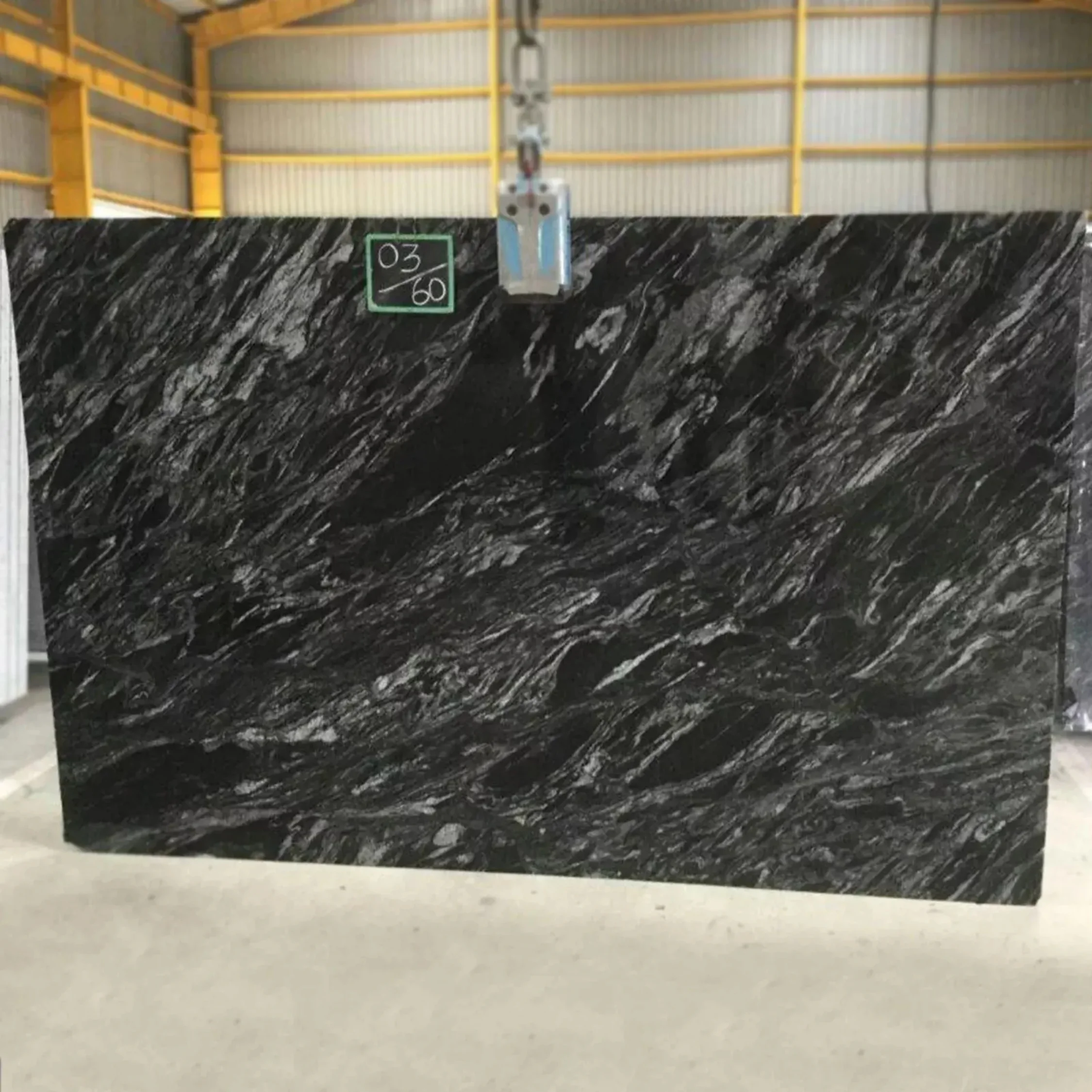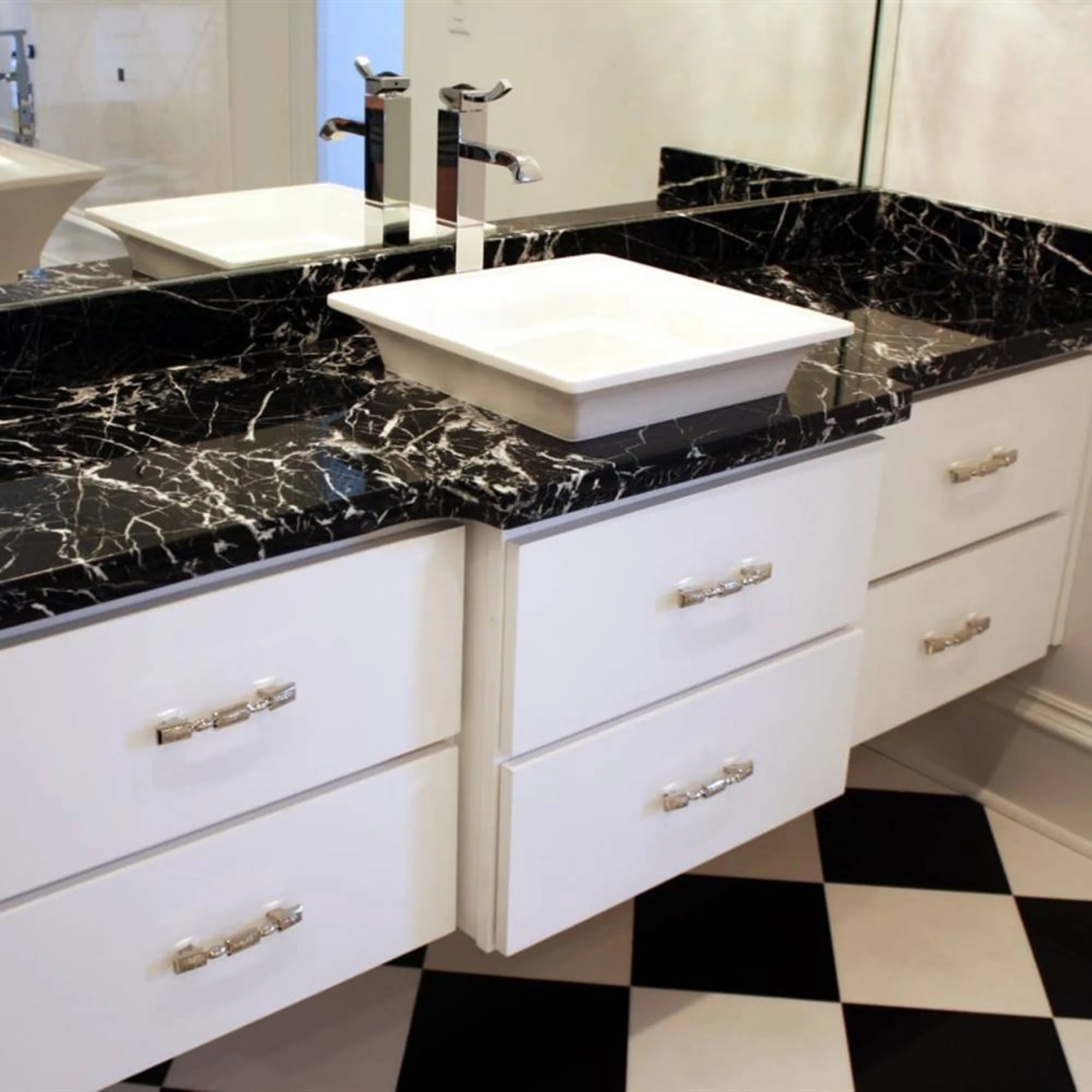 Black Marquina Granite is a striking and luxurious natural stone known for its deep black background and bold, white veining that resembles marble but with the durability of granite. Originating from the Marquina region in northern Spain, this stone is highly sought after for its elegant aesthetic and unique, dramatic appearance. The veins that run through the stone are typically sharp and well-defined, creating a striking contrast against the solid black base, making it an eye-catching choice for both modern and traditional designs. This granite is particularly prized in high-end residential and commercial applications, where its sophisticated look adds a touch of elegance to interiors. It is commonly used for countertops, flooring, wall cladding, and even decorative features like backsplashes and fireplace surrounds. Its luxurious appearance makes it a favorite for creating a statement piece in kitchens and bathrooms, but it can also be used in larger scale installations such as hotel lobbies, office spaces, and high-traffic areas. In terms of physical properties, Black Marquina Granite is known for its strength and resilience, offering resistance to scratches, heat, and stains.