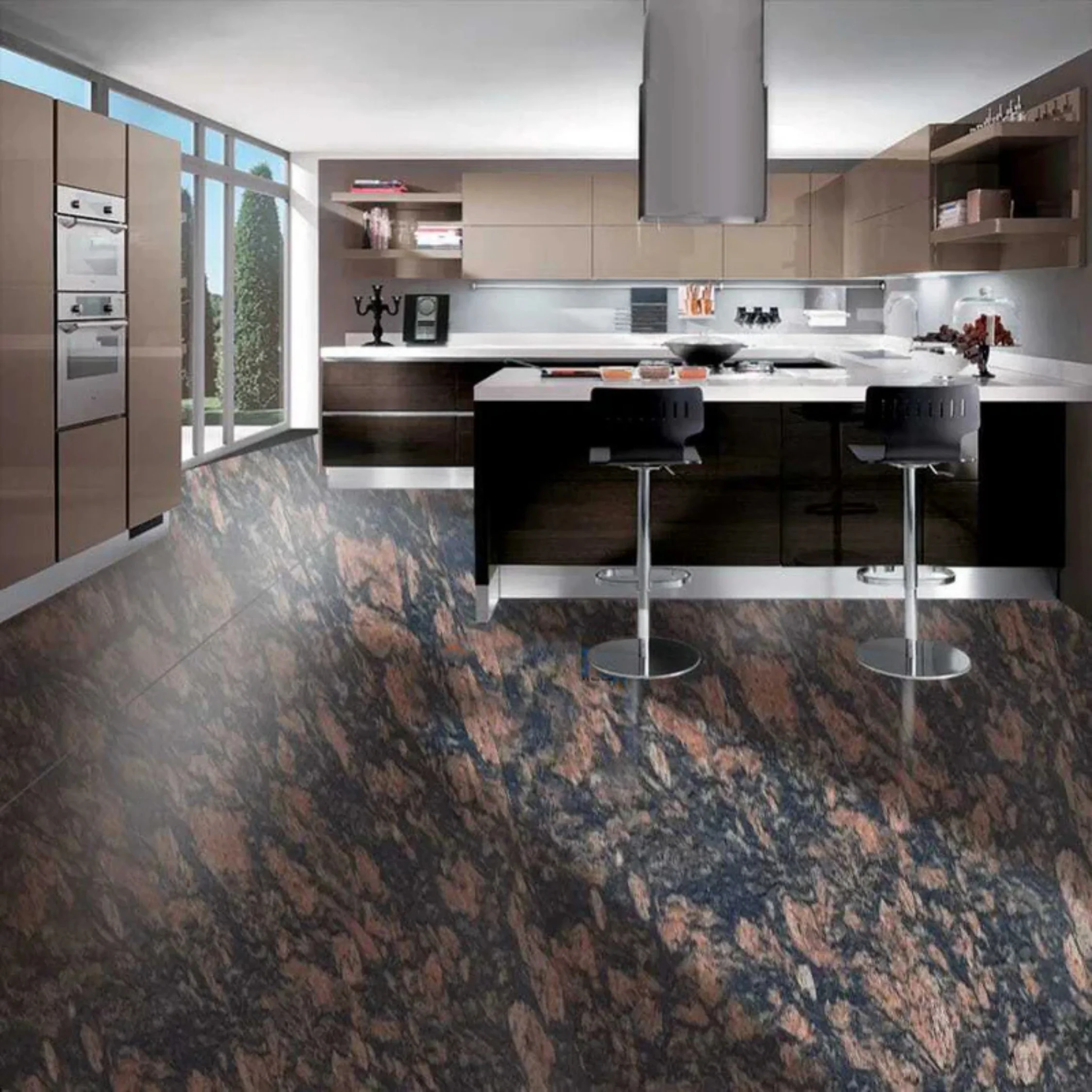 Brazil Brown Granite is a luxurious and durable natural stone known for its rich brown hues and unique veining patterns. Quarried in Brazil, this granite is highly valued for its strength and striking visual appeal. The stone typically features a deep brown base with veins of black, gold, and cream that create a dramatic and sophisticated appearance. Each slab is unique, with variations in the intensity and pattern of the veining, making it a popular choice for high-end interior and exterior designs. Due to its remarkable durability, Brazil Brown Granite is resistant to scratches, heat, and stains, making it an excellent option for a variety of applications. It is commonly used for countertops in kitchens and bathrooms, where its elegant appearance and resilience are highly desired. The stone's polished finish enhances its glossy surface, while other finishes, such as honed or leathered, offer a more matte or textured look depending on the desired aesthetic. Beyond countertops, Brazil Brown Granite is also widely used for flooring, wall cladding, and fireplace surrounds, providing a refined and luxurious touch to both residential and commercial spaces.